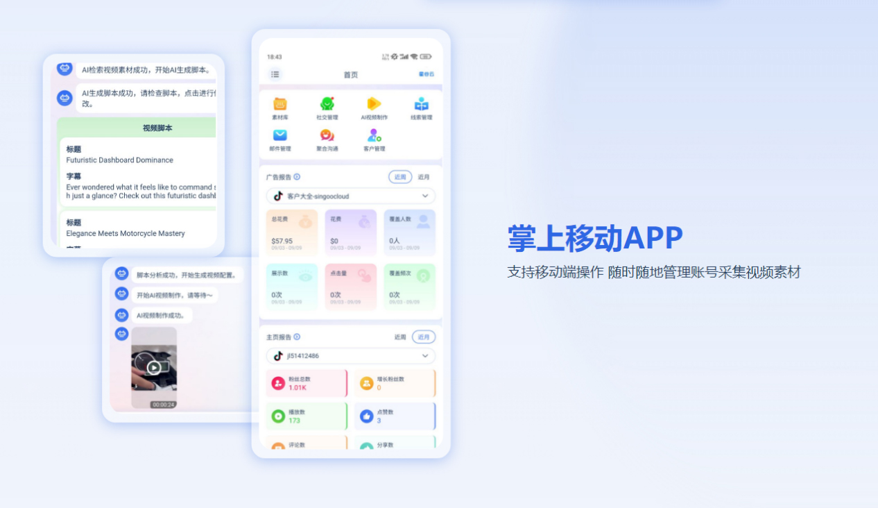 • AI短视频运营专家:这正是应对本文主题需求的核心模块。它支持TikTok、Facebook Reels等多平台账号的统一管理。企业员工可通过移动端APP随时拍摄产品、厂貌等素材并上传至云端素材库,通过简单的文字描述,AI即可理解素材内容。用户仅需设定主题、目标市场等参数,该智能体便能自动挑选素材、撰写脚本、完成剪辑与配音,声称可在数分钟内生成适配平台的营销短视频。此外,其提供的多语言、多音色“AI数字人”功能,为视频增添了真人般的讲述者,有助于提升信任感与感染力。