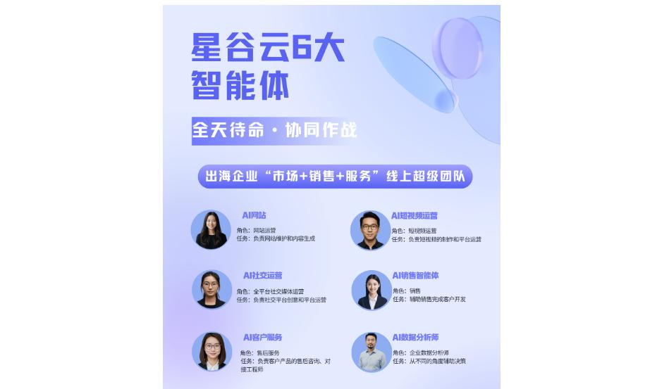 星谷云平台并非单一工具,而是由六个各司其职又协同作业的AI智能体组成矩阵: